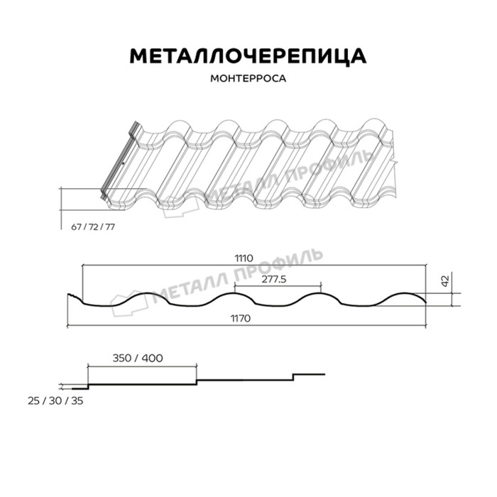 Данный профиль удачно сочетает в себе высокий рельеф и округлость очертаний. Хоть Монтерроса® и высокий профиль, но горизонтальные стыки металлочерепицы незаметны благодаря фигурному резу нижней кромки. Модифицированные боковые замки гарантируют герметичность кровли. Чтобы подчеркнуть индивидуальность своего дома, при покупке черепицы можно варьировать высоту и длину ступеньки. Металлочерепица Монтерроса® изготавливается с полимерными покрытиями из ассортимента компании «Металл Профиль». Это обеспечит вашей кровле благородный внешний вид и надёжность. Металлочерепица Монтерроса® выпускается на современном оборудовании мирового класса. Таким образом, вы, без сомнения, приобретаете солидную и прочную крышу со стальной основой и полимерным покрытием.