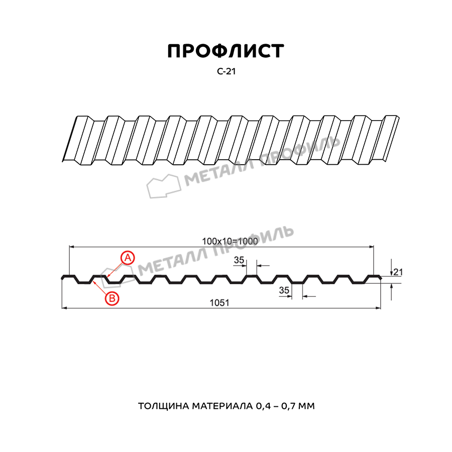 Профлист Металл Профиль C21 0.4 Цинк Без покрытия Бесцветный B