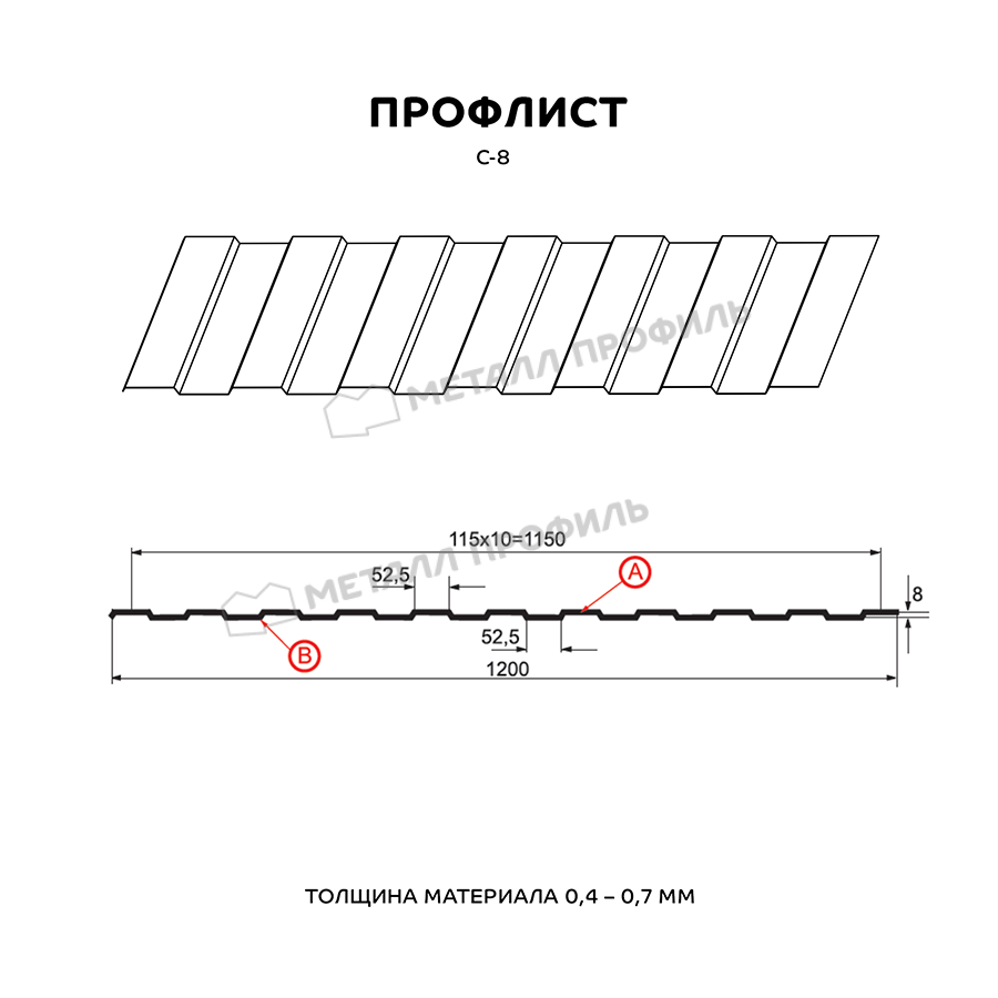 С-8 – самый низкий и экономичный профиль. Его несущая способность сравнительно невелика, в связи с этим такой профнастил не применяется в конструкциях, требующих высокой жёсткости. Как правило, С-8 используют для обшивки фасадов, а также для строительства ограждений и подвесных потолков. Характеризуясь маленькой высотой – всего 8 мм – одновременно он имеет максимальную полезную ширину – 1150 мм. Чаще всего на производство С-8 берётся металлопрокат толщиной от 0,4 до 0,7 мм. Это оптимальные параметры для облицовки фасадов или установки заборов в климатических зонах с низкой ветровой нагрузкой. Для вспомогательных построек ( туалетов, сараев, бытовок, времянок) в Компании Металл Профиль можно купить профнастил без полимерного покрытия толщиной 0,35 и менее мм, чтобы не переплачивать без необходимости.