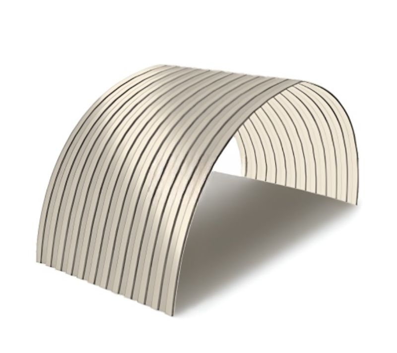 Профнастил для арочных перекрытий используется прежде всего при строительстве различных арочных конструкций, у которых существует определенный изгиб по радиусу. Он активно применяется при возведении ангаров, складов, зернохранилищ, различных округлых и полукруглых вариантов крыш и кровли. С его помощью можно построить как большое здание сельскохозяйственного назначения, так и красивый эстетичный навес для автомобиля площадью несколько квадратных метров. Основной отличительной особенностью данного вида профлиста является его изогнутая по радиусу форма, сформированная на специально предназначенной для этого профилегибочной линии. Радиус изгиба может быть самый разнообразный, и зависит прежде всего, от требований заказчика и характеристик будущего здания. Плюсами такого материала являются как его изготовление в заводских условиях, так и геометрическая точность, в результате чего стыки листов практически не видны и конструкция выглядит действительно монолитной.